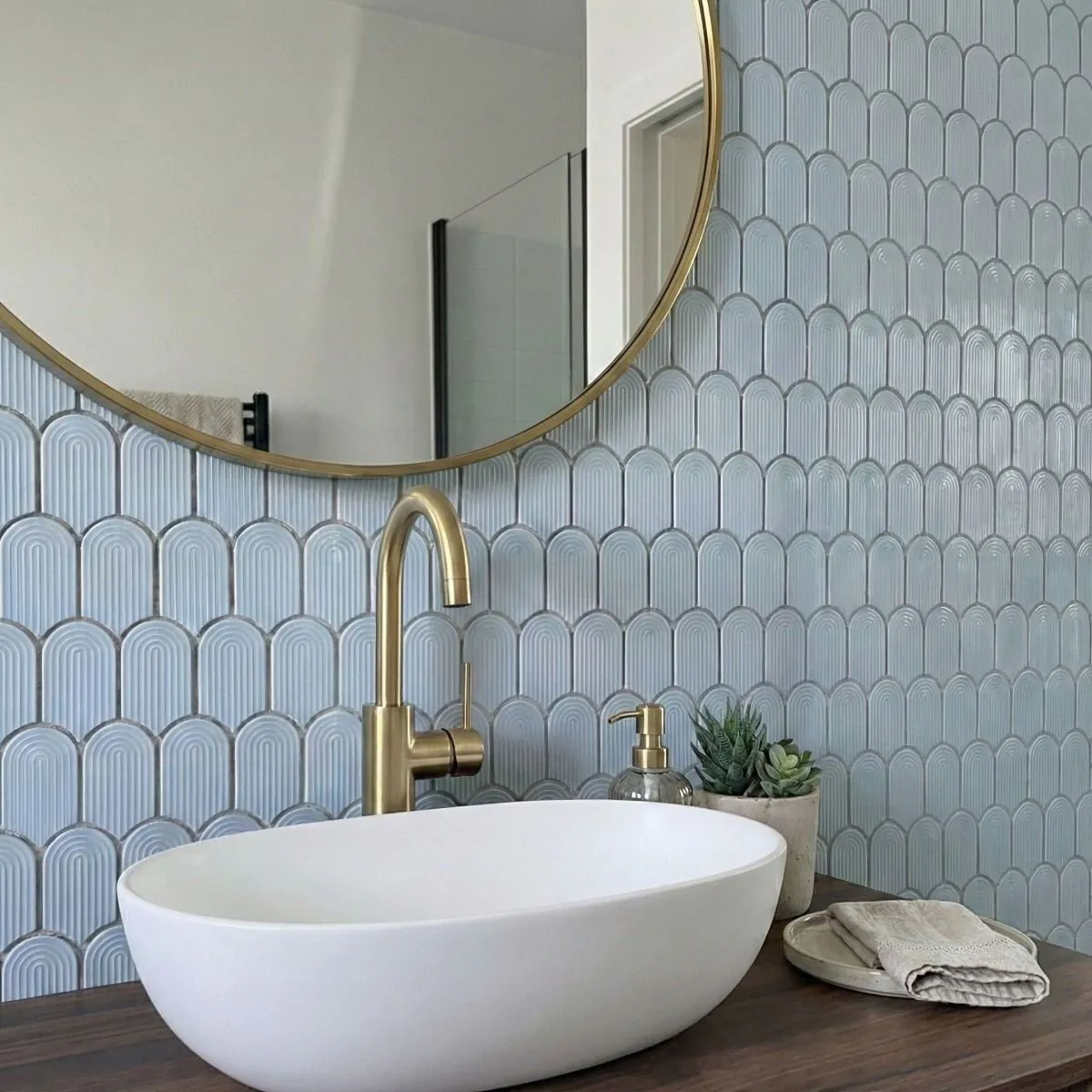 Kolekcja Wave to połączenie klasycznego kształtu rybiej łuski z nowoczesnym efektem ryflowania. Mozaiki o trójwymiarowej powierzchni tworzą na ścianie delikatną grę światła i cienia, nadając aranżacji wyjątkowej głębi oraz subtelnego ruchu. Inspiracją dla Wave Baby Blue Matowy były naturalne fale i refleksy wodne, które od wieków kojarzą się z harmonią i lekkością. Unikatowa faktura i organiczny kształt sprawiają, że kolekcja doskonale odnajduje się zarówno w eleganckich, klasycznych wnętrzach, jak i w odważnych projektach nowoczesnych.